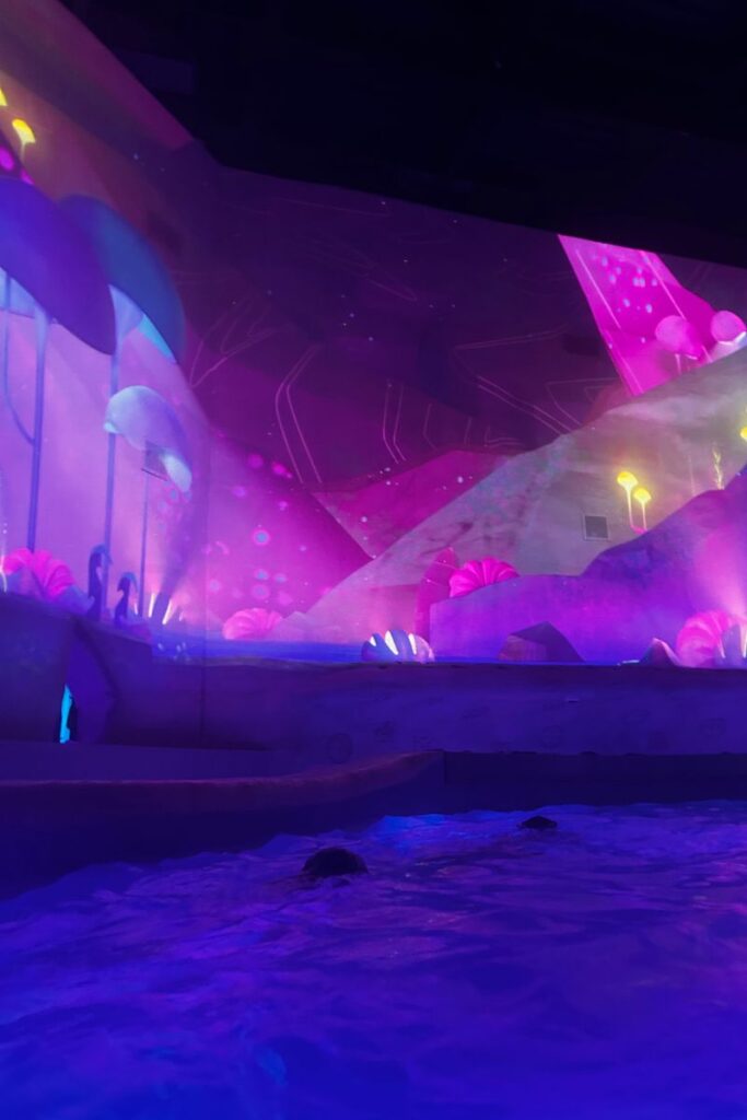 Pero lo que realmente convierte a Aquascope en algo diferente es su experiencia sensorial. Hay varias zonas completamente oscuras, con piscinas donde las pantallas gigantes te envuelven en la historia de Kraki, la mascota del parque.