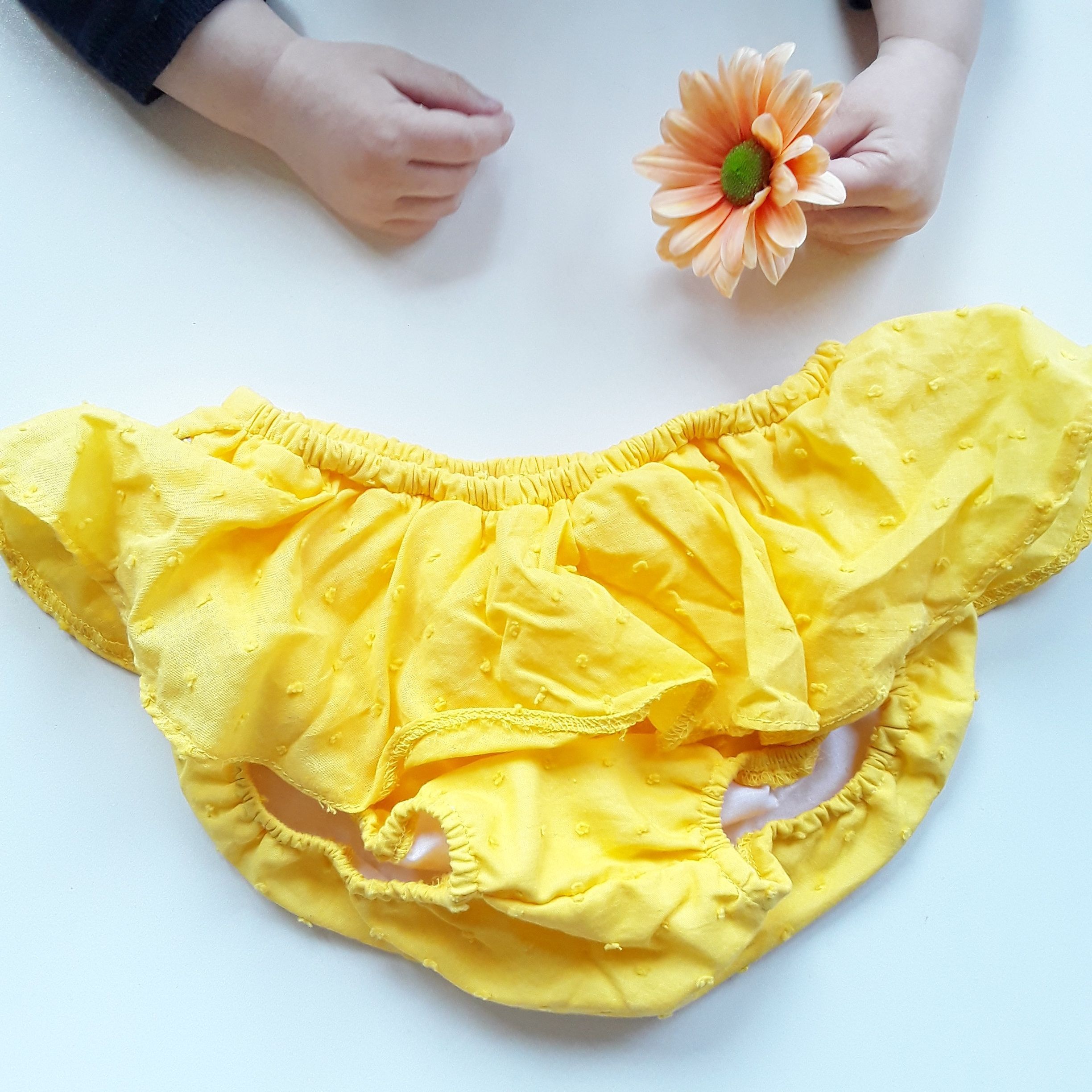 Cubrepañal con volantes amarillo.